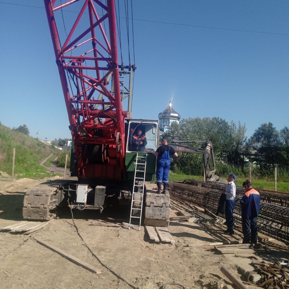 Проектом производства работ предусмотрено бурение шахт бурильной машиной на глубину до 25 метров, установка краном гильз, арматурного каркаса и заливка бетона под будущие несущие стойки моста.