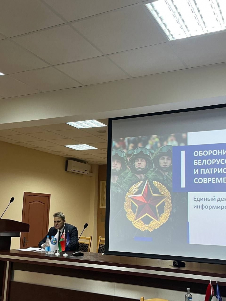 Тему ЕДИ «ОБОРОНИТЕЛЬНАЯ МОЩЬ БЕЛОРУССКОЙ АРМИИ И ПАТРИОТИЗМ В СОВРЕМЕННЫХ УСЛОВИЯХ» для работников организации раскрыл управляющий делами Октябрьского района г. Минска Баранов Юрий.