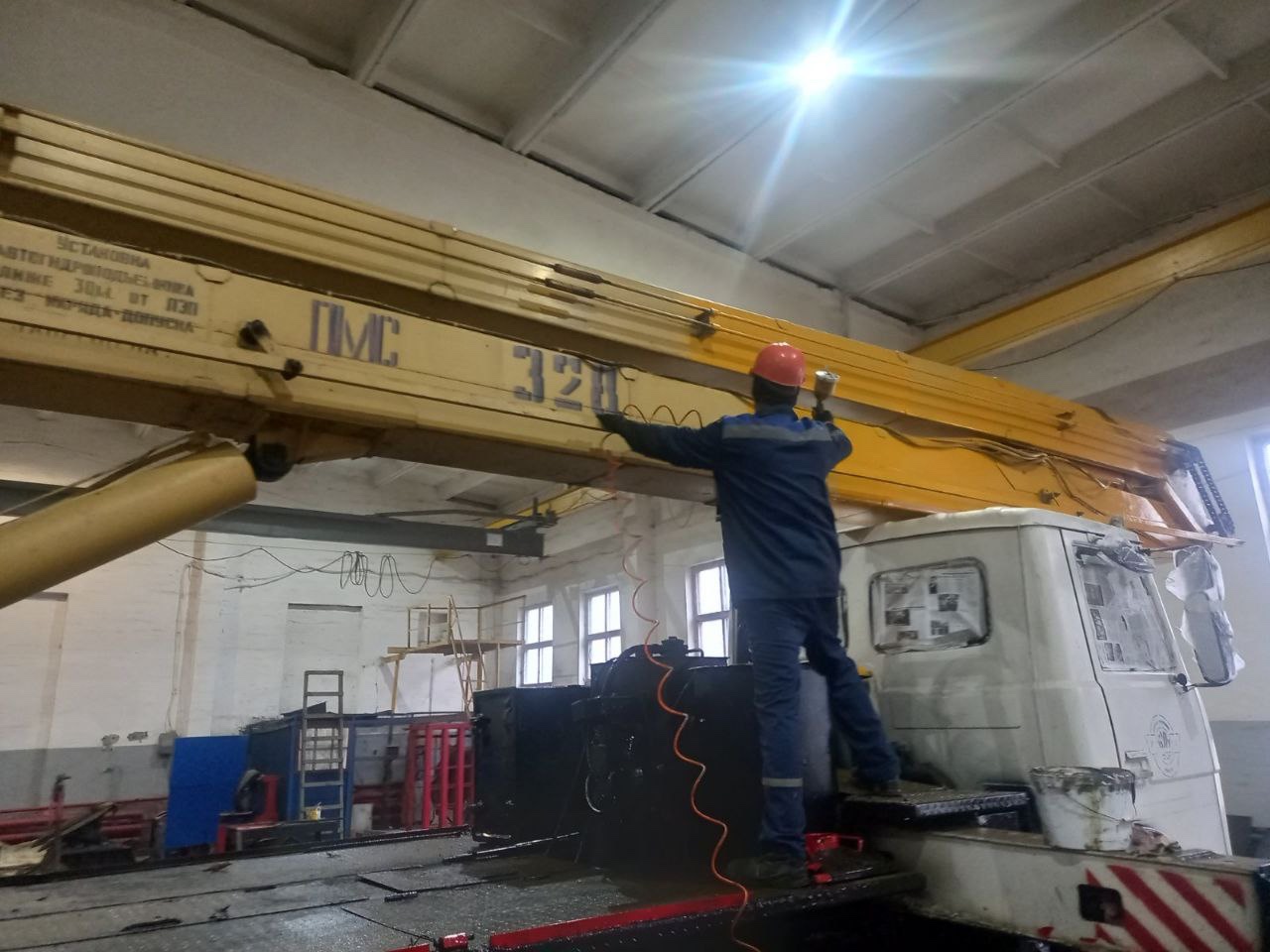 Кузьмицкий Сергей (слесарь по ремонту ДСМ и тракторов), Булыгин Владимир (машинист крана), Крисенков Юрий (машинист крана), Жуков Александр (машинист автовышки и автогидроподъемника) собственными силами произвели работы по подготовке к замене масла на кране КС 65727 и выполнили подготовку к техническому осмотру автовышки ПМС 328. В результате слаженной работы техника прошла технический осмотр и снова в строю.
